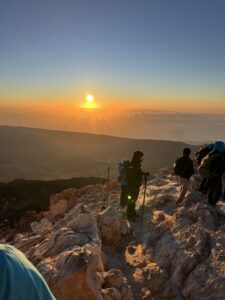 La montée s’est bien déroulée, et nous avons fait des pauses régulières pour reprendre notre souffle. Après un certain temps, nous avons atteint un refuge où j’ai pu me restaurer avant de reprendre l’ascension. C’est là que nous avons dépassé d’autres groupes, moins en forme que nous. Nous avons continué à progresser, et à mesure que nous nous rapprochions du sommet, le soleil commençait à se lever, offrant un spectacle splendide.